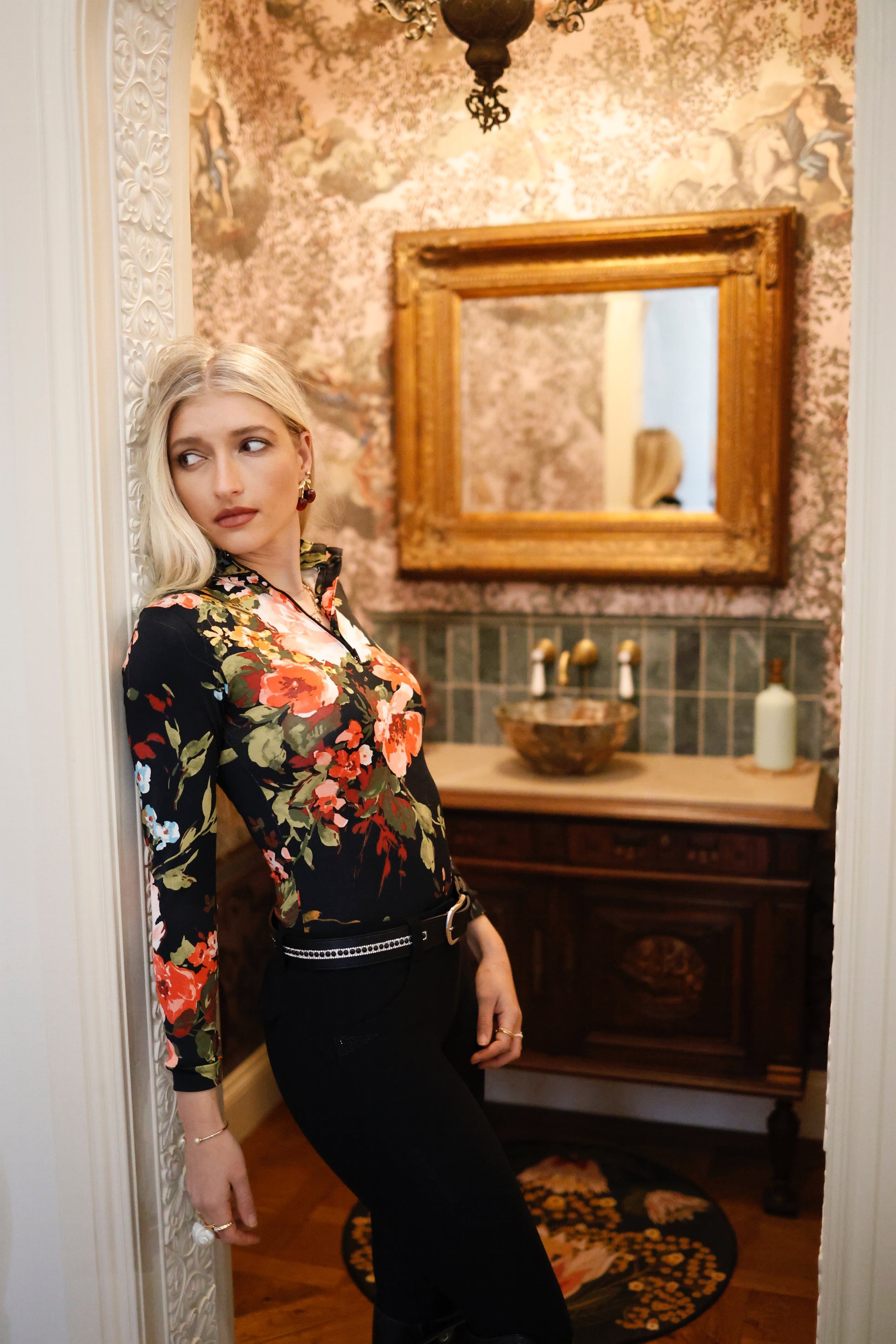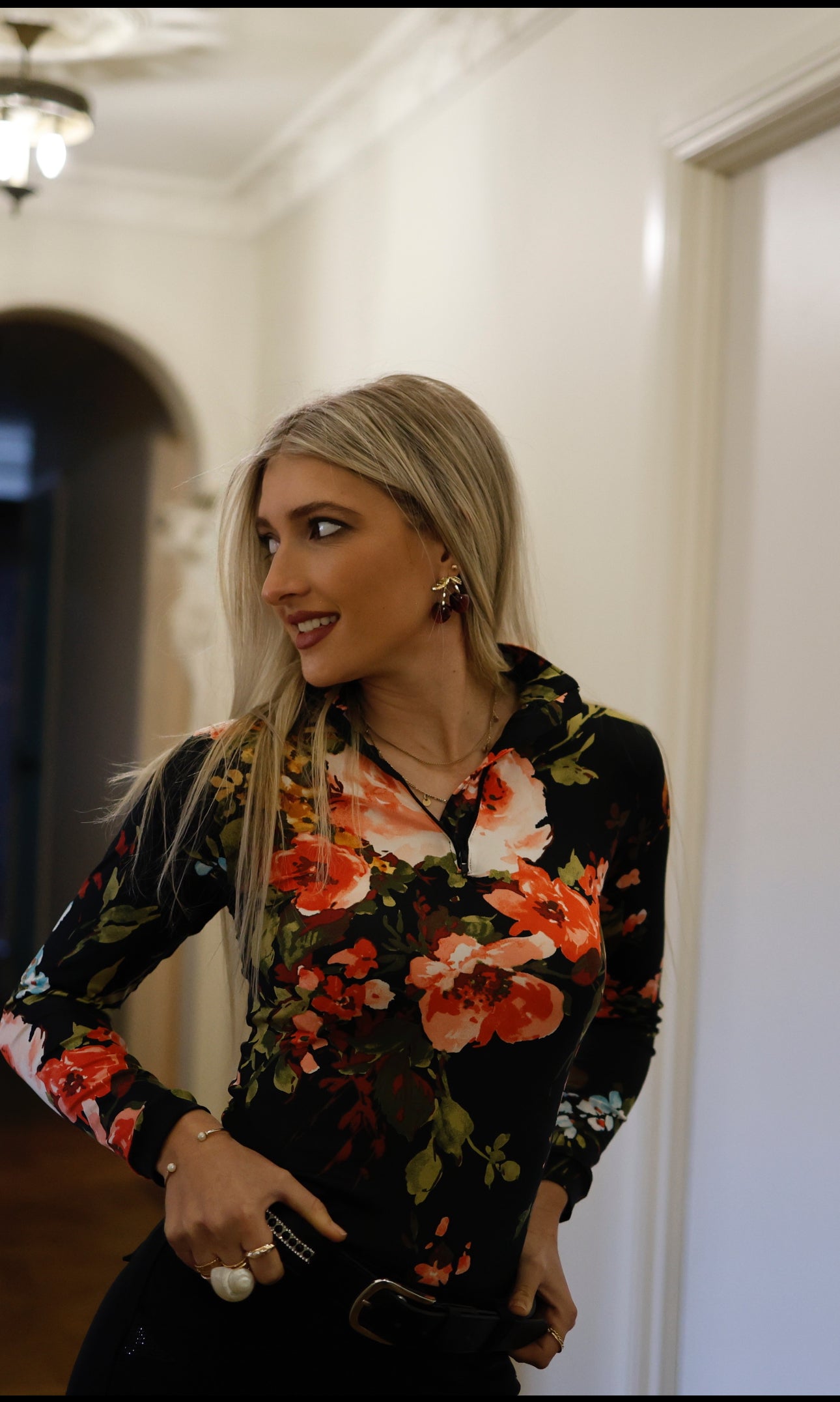 Gorgeous soft 4 way stretch Pila Spandex Fabric, Floral Pattern on a Black background. Each shirt will have a slightly different pattern placement adding to its individuality. The perfect addition to you wardrobe... great fabric for the warmer weather. (Fabric pattern will be slightly different in each shirt)