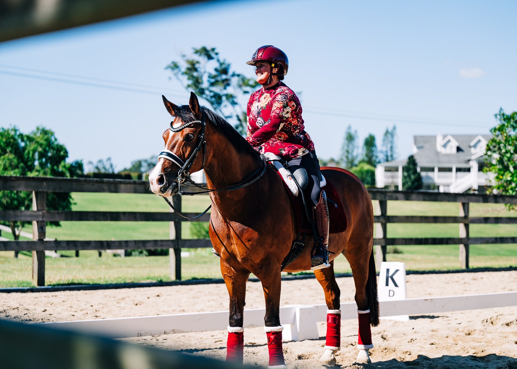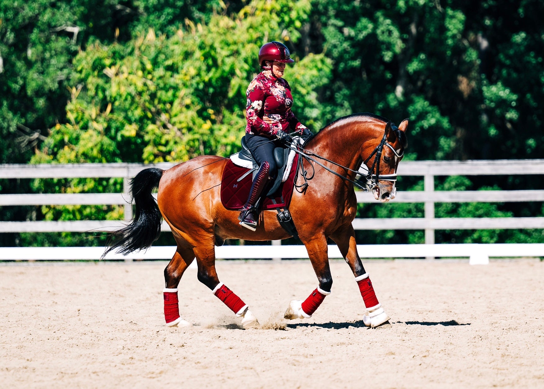 Soft 4-way stretch Ruby shirt with floral print on a maroon base. Easy wear easy care, Perfect as a base layer or stand alone shirt. A cool hand wash or gentle cycle in the washing machine will keep this shirt looking its best.(Fabric pattern will be slightly different in each shirt)